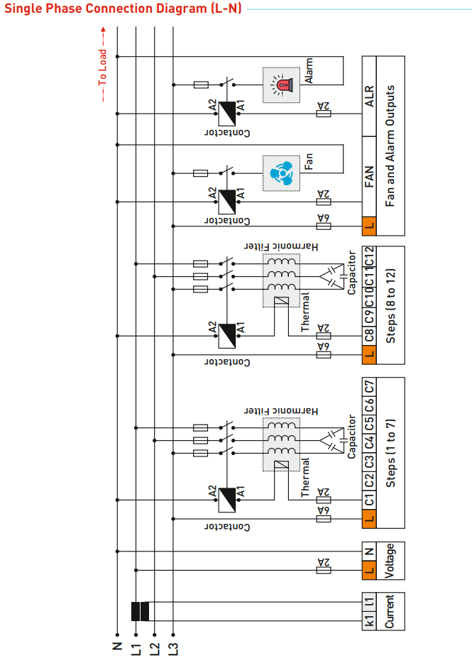 The RGM-12S reactive power controller is designed to reduce inductive power drawn from the grid, not from loads. When inductive reactive power is drawn from the grid, it intervenes by activating the capacitors with the appropriate value. In this way, it attempts to bring the cos fi value to the desired level.
